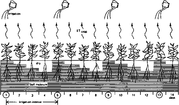An irrigation water need of 8 mm/day, however, does not mean that this 8 mm has to be supplied by irrigation every day. In theory, water could be given daily. But, as this would be very time and labour consuming, it is preferable to have a longer irrigation interval (see Figure 2). It is, for example, possible to supply 24 mm every 3 days or 40 mm every 5 days. The irrigation water will then be stored in the root zone and gradually be used by the plants: every day 8 mm. The irrigation interval has to be chosen in such a way that the crop will not suffer from water shortage. This is shown in the example on page 2.