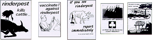 Posters and leaflets1. Rinderpest kills � rinderpest is a cattle thief Healthy cattle with plenty of fodder and water available, can still be infected and die quickly from rinderpest. 2. Vaccinate! Vaccination can protect cattle against rinderpest. A wise cattleowner allows the veterinary services to carry out all immunization procedures. 3. Report! Cattleowners and local authorities must know the symptoms of rinderpest and report suspected outbreaks quickly to the veterinary services. 4. A sign of value Cattle with the cloverleaf earpunch are more valuable because they are protected against rinderpest. The earpunch is recognized by the veterinary services, government authorities, law enforcement agencies, cattle merchants. It is also recognized in bordering countries as the insignia of the PARC immunization programme. 5. Fewer, but better, cattle Introduces an important PARC theme - that when cattle are protected against disease (such as rinderpest) herds can be smaller because they are at less risk. if the smaller herd contains higher-quality cattle, it will be more productive. Fewer cattle will reduce the threat of overgrazing and land degradation. A selection of items in the PARC kit ![]() Flipcharts1. The relunctant cattleowner The disaster that can befall the cattleowner who does not allow his cattle to be vaccinated 2. The wise cattleowner in contrast to the reluctant cattleowner, the wise cattleowner benefits from cooperating with veterinarians. 3. Isolate sick animals Cattleowners should be shown the benefit of isolating sick animals from healthy ones. A good subject for a flipchart to inform cattleowners. Various themes in the PARC kit. ![]() |