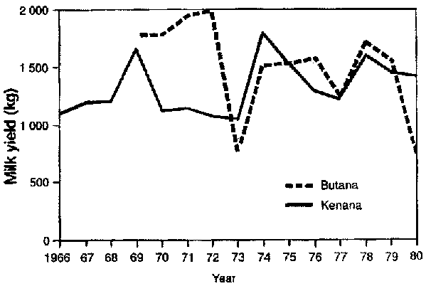Milk yields of the two breeds in age groups, seasons and parities are given in Table 1. The average 305-day milk of the two breeds was 1 405 ±695 kg and factors having a significant effect on lactation milk yields were sire and year of calving. These findings agree with those of Alim (1962). Milk yields fluctuated over the years recorded (see Figure 3), resulting possibly from changes in management and levels of feed available. Daily milk yield was affected (p<0.05) by sire and year of calving, and lactation and daily milk yields were similar among age groups, seasons and parities (see Table 1).