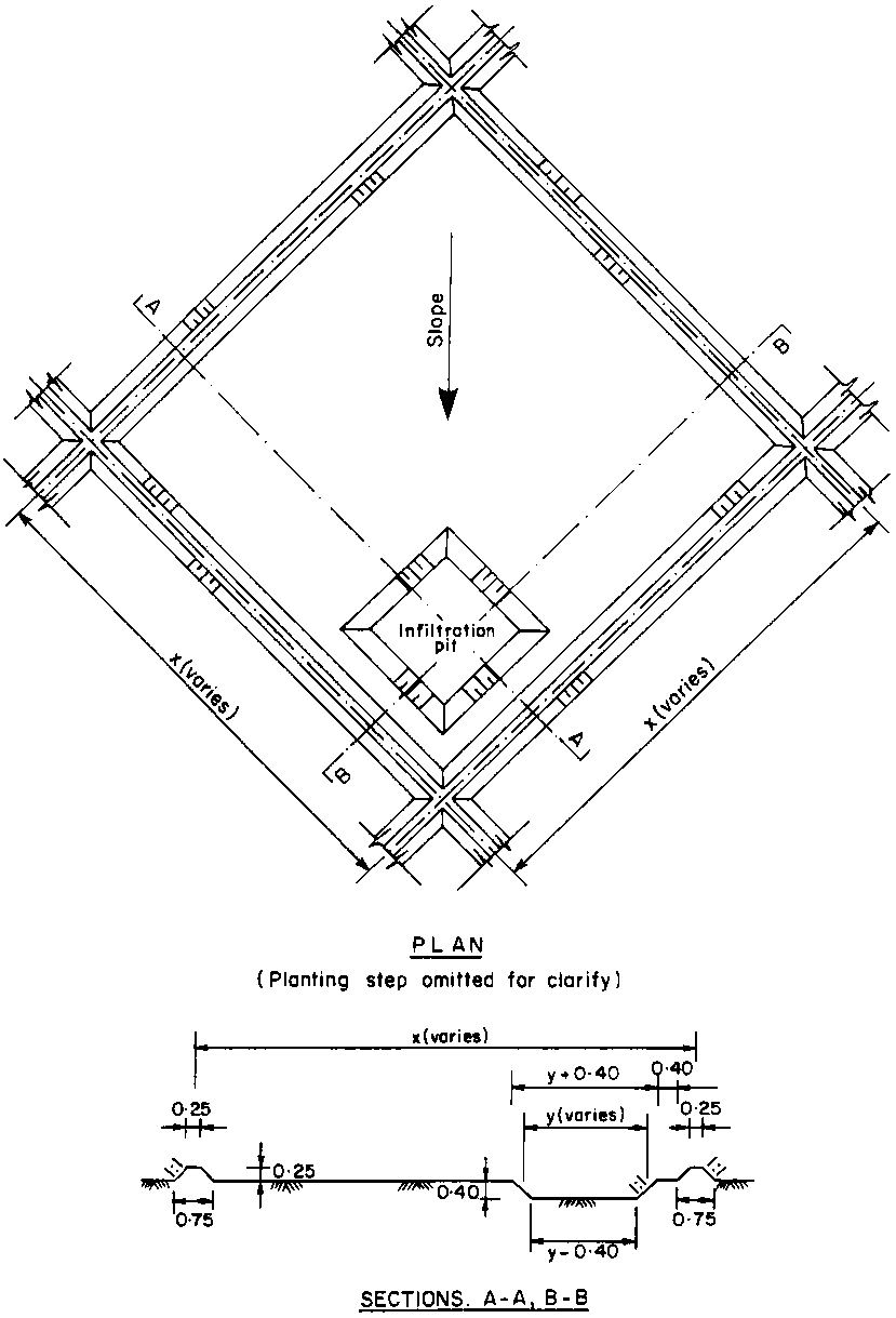 Each microcatchment consists of a catchment area and an infiltration pit (cultivated area). The shape of each unit is normally square, but the appearance from above is of a network of diamond shapes with infiltration pits in the lowest corners (Figure 17).