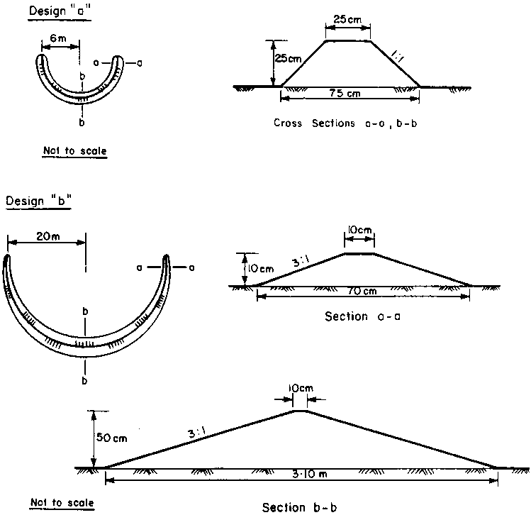 There are many different designs for water spreading bunds possible, and that given in this manual is merely one example. Much depends on the quantity of water to be spread, the slope of the land, the type of soil and the labour available. Existing systems are always worth studying before designing new systems.