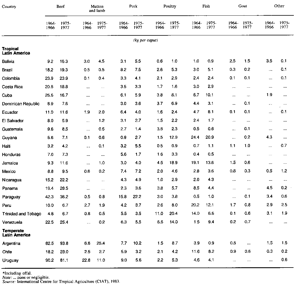 Table 1 shows the level of meat consumption in most Latin American countries for the periods 1964-1966 and 1975-1977. In Table 2, the consumption data are rearranged to show the per caput consumption of all meats in 1975-1977 and also the share of each meat type. The variation in total meat consumption across countries is wide ranging from about 13 kg to 141 kg - reflecting the substantial variation in both income and agricultural resources.