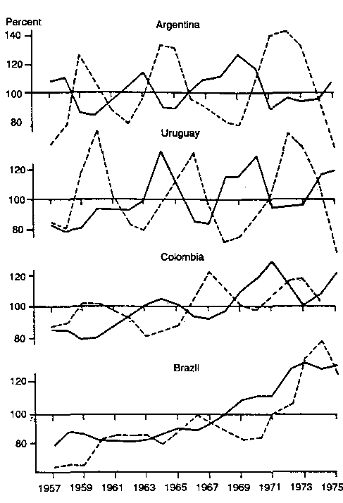 Price patterns for cattle in selected South American countries - Evolution cyclique des prix du bétail dans certains pays d'Amérique du Sud - Ciclos de precios de ganado en algunos países de América del Sur