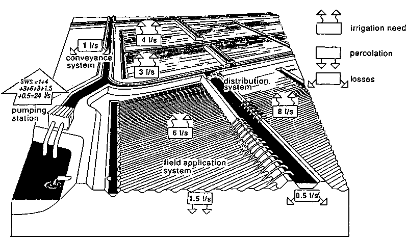 The supply of water to the irrigation system, SWS, should be almost if not equal to the demand for water, SINgross, which is the total of the irrigation need for all fields plus the water loss (see Figure 1) during transport and distribution.