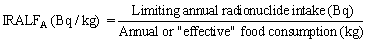 The Consultation derived numerical IRALFs for two groups only, infants and adults, and agreed that the general IRALF to be adopted should be the lower of the two. For infants it was assumed that food intake would be 1 kg daily and the dose conversion factors would be based on Johnson and Dunsford (1983), and for adults it was assumed that food intake would be 2 kg daily and the ICRP dose conversion factors for workers should be used (ICRP, 1979). It was further assumed for the purpose of calculating IRALF values that: