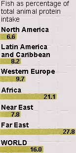Fishing is an important source of highly nutritious food, income and employment. Millions of people in Asia get most of their dietary protein from the aquatic harvest. In all, marine and inland fisheries provide nearly 30 percent of the region's animal protein; in Africa the proportion is 21 percent; in Latin America, 8 percent. About 30 percent of world production is turned into fishmeal to fatten livestock or farmed fish rather than eaten directly by humans.