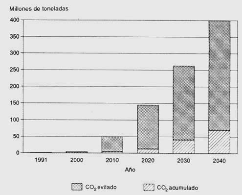 Para ilustrar el efecto potencial de las superficies arboladas urbanas sobre el CO2 atmosférico se formuló un modelo para un período de 50 años acerca del efecto de plantar entre 1991 y el año 2000 10 millones de árboles de 3,0 cm de diámetro cada año en el conjunto del territorio urbano de los Estados Unidos (Figura 2). Se partía del supuesto de que esos 100 millones de árboles serían plantados en lugares adecuados en torno a los edificios para conservar la energía.