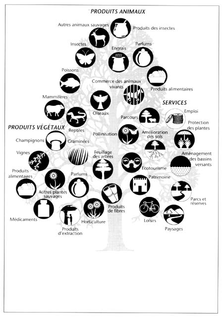 Lorsque la forêt se rétrécit ou lorsqu'elle est abattue, la perte est loin de concerner seulement les arbres. La forêt héberge de nombreux animaux et plantes dont la survie dépend de l'environnement qu'elle leur offre. Beaucoup de ces espèces, leur valeur potentielle pour la société et leur importance écologique sont encore à découvrir. Entre autres trésors inexploités il y a des cultures possibles, des produits pharmaceutiques, des bois, des fibres, des pâtes, une végétation restauratrice du sol, des produits de remplacement du pétrole et d'innombrables autres produits et ressources. L'écorce du rare if occidental Taxus brevifolia, qui n'existe plus maintenant que dans l'ancienne forêt de conifères du nord-ouest des Etats-Unis, est la source du taxol, l'une des plus puissantes substances anticancérigènes que l'on ait découverte. Si les forêts continuent d'être abattues au rythme actuel, de nouvelles sources d'information scientifique seront probablement perdues et une inestimable richesse biologique sera détruite.