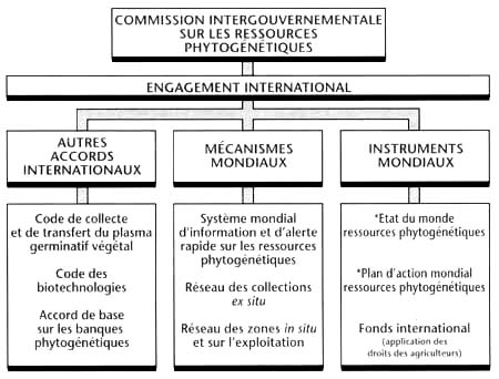 Les principaux éléments du système approuvé par la Conférence de la FAO sont la Commission sur les ressources phytogénétiques et l'Engagement international sur les ressources phytogénétiques (voir diagramme cicontre). A ce jour, 135 pays ont officiellement adhéré au Système mondial.