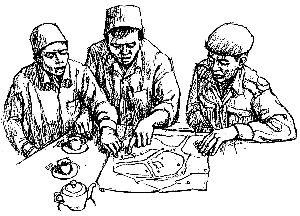 No processo de definir os problemas e identificar as possíveis soluções, também se podem aproveitar mapas elaborados pelos diferentes grupos. Neles se poderá identificar a localização das casas os espaços para produção ou coleta de alimentos, a coleta de lenha para combustível, os pontos de distribuição de alimentos, as fontes de água e os serviços de saúde. No mapa 2, se mostra um exemplo dos resultados deste tipo de exercício de um projeto participativo de nutrição em uma comunidade das Filipinas.