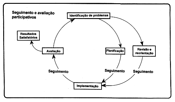O processo de seguimento e avaliação é um procedimento contínuo, integrado no projeto desde seu início. É difícil, num projeto participativo de nutrição, separar as etapas de identificação de problemas, seleção de atividades e seguimento e avaliação. As atividades aumentam o grau de tomada de consciência, compreensão e participação, o que, por sua vez, leva à redefinição de objetivos e escolha de novas prioridades. O processo de seguimento e avaliação proporciona oportunidade para o aprendizado através das ações.