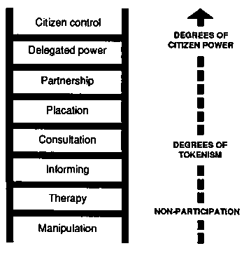 Many levels of participation, ranging from non-participation to full citizen control, have been described (Renouf, 1993); these are illustrated in the accompanying figure.