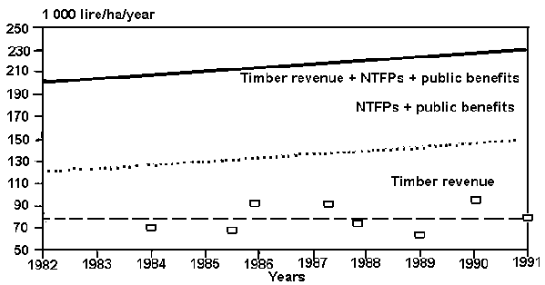 The balance sheet of timber revenues and costs shows annual losses (see Fig. 3), particularly in the second half of the 1980s, because of higher management costs and reduced fellings. However, if the value of unexploited timber (capitalized as growing stock) is taken into account, the balance sheet becomes slightly positive. If NTFPs and public benefits from recreation are considered, the income statement becomes largely positive.
