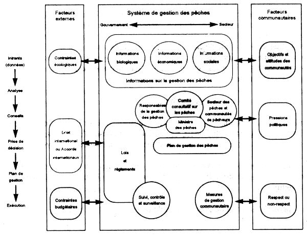 A quel stade de la gestion des pêches le SCS intervient-il? L'organigramme de la gestion des pêches, qui figure à la page suivante, aide à répondre à cette question4. En gros, cet organigramme montre que la gestion des pêches comprend trois composantes imbriquées, à savoir: