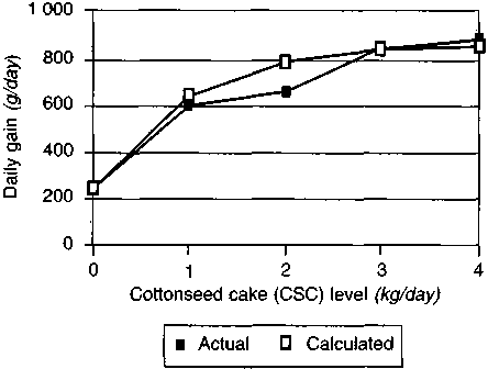 From a development and resource perspective, the responses to the first 1 to 2 kg of CSC are the most interesting, because at these levels straw still constitutes around 75 percent of the diet, and straw is the most abundant feed resource in the two provinces. CSC supplementation at 1.5±0.5 kg dramatically improves feed efficiency, bringing total feed dry-matter requirements down from 20 kg or more per kilogram of liveweight gain to 10 to 12 kg.