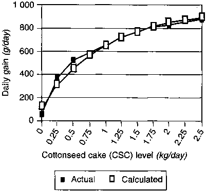 These trials met the primary objective of identifying responses to increasing levels of CSC supplementation, and they clearly demonstrated that feeding ammoniated straw alone is inadequate in terms of exploiting the great potential of a basal diet of ammoniated wheat straw for beef production. In Henan, growth rates on ammoniated straw were only 250 g/day versus 63 g/day in the Hebei trial.