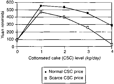 Because of the periodic seasonal scarcity of CSC, profit was calculated at two price levels representing normal (Y0.40/kg) and scarce (Y0.60/kg) supply situations. Some parts of Hebei Province recently suffered high prices as a result of low cotton production. In addition, profit was determined per head for the duration of the fattening period, as well as per day. The 'break-even' daily gain is the growth rate required to cover variable, mainly feed, costs. Break-even CSC price is that which would result in zero profit. Total costs include the purchase price of the cattle.