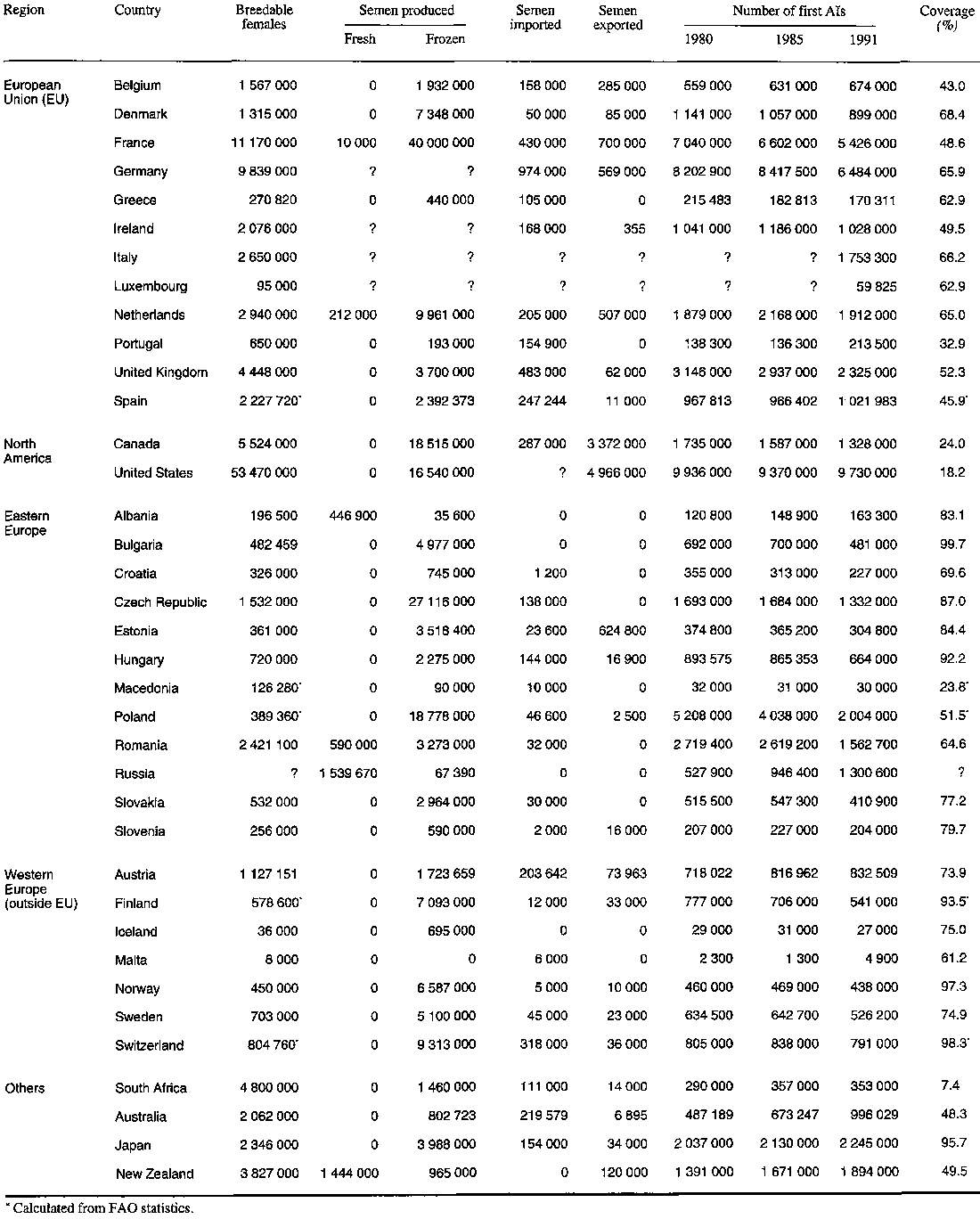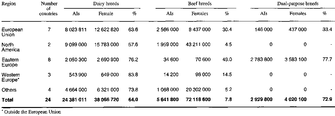 The very high rates claimed by a few countries are questionable. For Eastern European countries, this may be a consequence of the former political centralization and of the existence of large state farms, all staffed with several AI technicians and veterinarians. But the rates for beef breeds in Ireland or for all types of females in Japan may suggest once more that not all the mistakes in the replies were detected and that the figures quoted sometimes refer to all AIs.