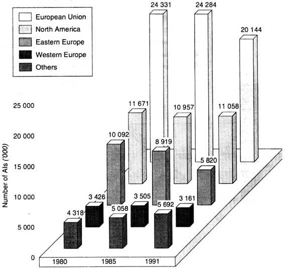 In 1991, the EU came first in terms of the total number of first AIs (20 144000), followed by North America (11 058 000), Eastern Europe (5 820000) and non-EU Western European countries (3 161 000). Among the four "other" countries, Japan came first with 2 245 000 AIs, followed by New Zealand (1 894 000), Australia (1 200 000) and South Africa (350 000).