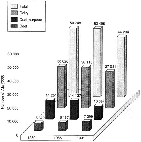 Altogether, 44 234 000 first AIs have been performed in developed countries in 1991 (Figure 4). This is clearly fewer than in 1980 (-6 514 000, or -12.8 percent), resulting, as was previously observed, from a general drop in AI activity. With regard to type of female, this phenomenon has been observed particularly in the dairy breeds (-3 745 000, or -12.1 percent) and with dual-purpose breeds (-4 197 000, or -29.5 percent), while a certain increase has taken place with beef breeds (+1 427 000, or +25.2 percent). It must be remembered that these figures may not be fully accurate, however, especially for beef breeds, as there was obvious confusion between semen breed and female breed in some replies. The most obvious cases were when beef semen was used for crossing dairy or dual-purpose females. In some questionnaires these were reported as being AIs in beef breeds, and therefore were larger in quantity than the number of available breedable females. These replies were discarded, but some may have remained undetected.