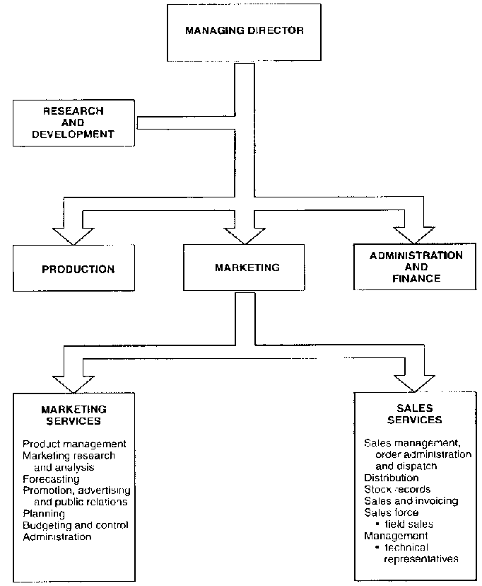 In larger companies marketing will usually form one of the four major management divisions (see Figure 1) together with Research and Development, Production, and Administration and Finance, although the structure and the degree of specialization will depend on the size of the organization. In smaller organizations one person may perform several functions or there may be just one person responsible for marketing and sales.