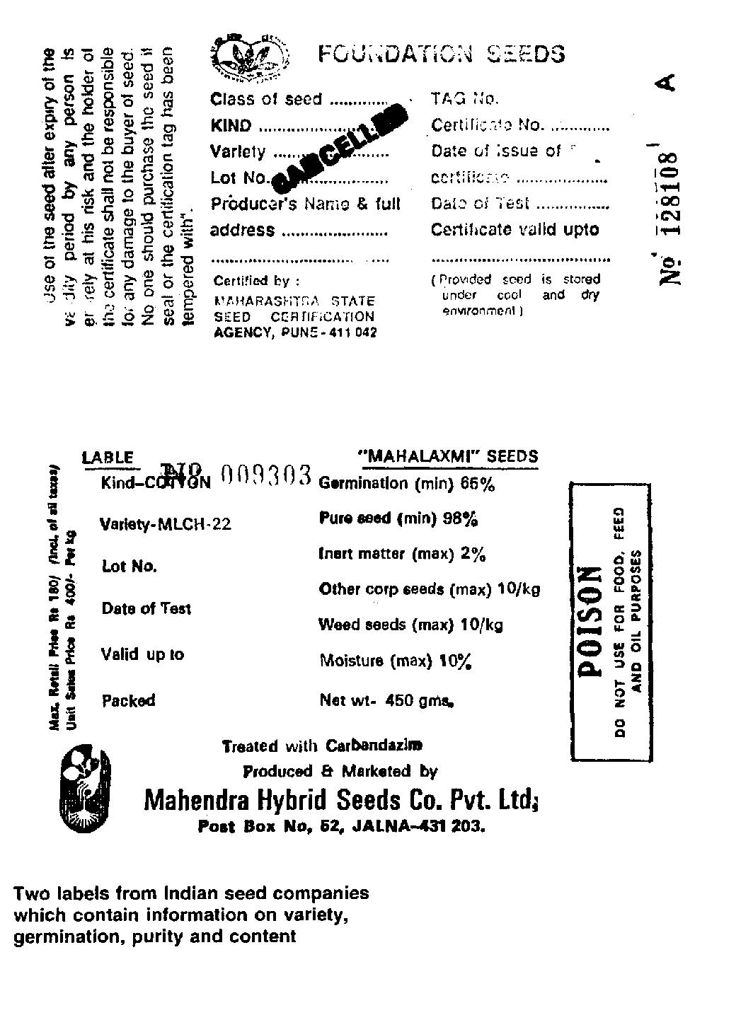 · species, variety, germination, purity and contents;