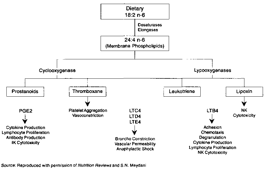Cooperation between different cells of the immune system via membrane-associated events and through different protein and lipid mediators is essential in mounting a successful immune system response. Dietary lipids can affect the immune system by influencing substrate availability in the formation of cyclooxygenase and lipooxygenase products. These products, in turn, act as lipid mediators in the control of the immune system (Rola-Plaszczynski, 1985 and Goodwin, Messner and Peake, 1974). Furthermore, the cells of the immune system are highly dependent on cell membrane function for operations such as the secretion of lymphokines and antibodies, antigen reception, lymphocyte transformation, and contact lysis. The importance of lipids in the maintenance of membrane integrity (Stubbs and Smith, 1984) indicates that they are potentially critical nutrients in the regulation of the immune function.