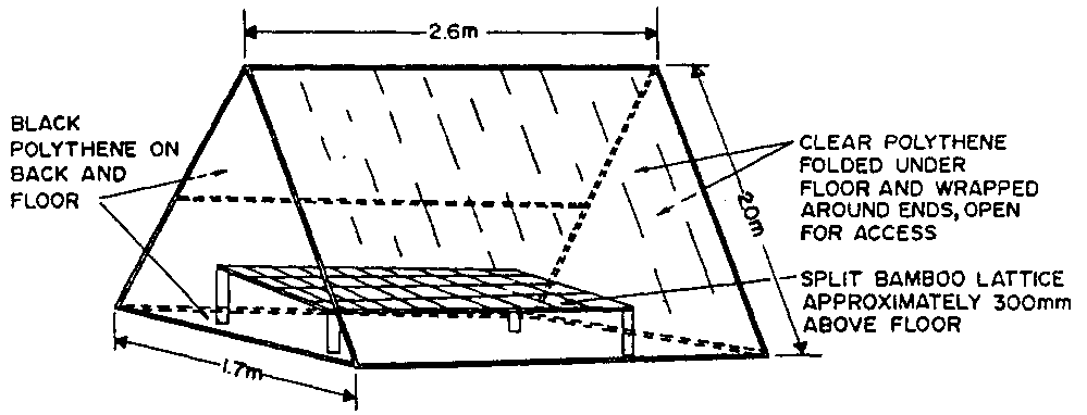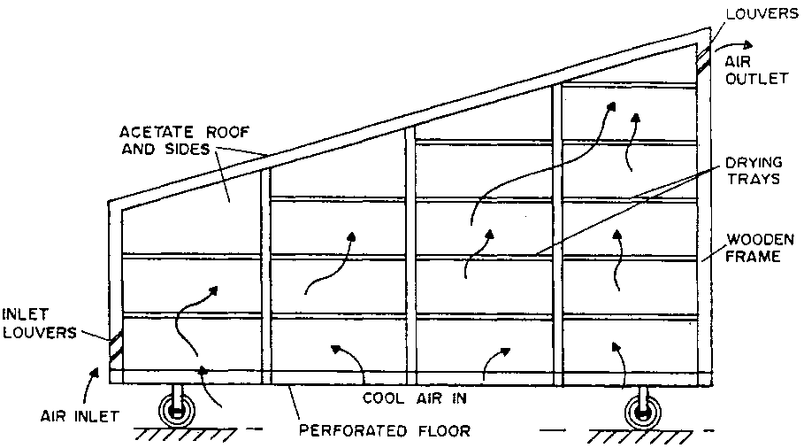 Careful design in the development stage of a dryer can often facilitate the use of cheaper materials. Difficulties caused by these materials are in joining pieces of the structure, in sealing the structure against air leaks, and in attaching the plastic sheet to the (wooden) frame. There is obvious scope for designs which use prepared timber for strategic points and unprepared at others.
