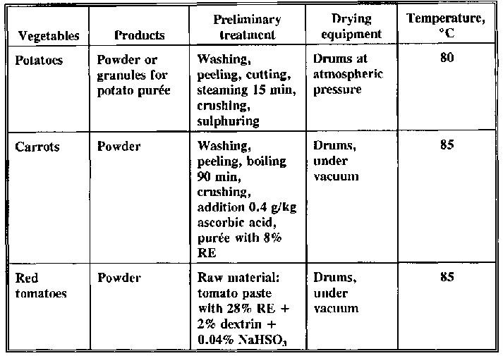 b) vegetables are transformed by boiling and sieving into purées which are then dried on heated surfaces (under vacuum preferably) or by spraying in hot air.