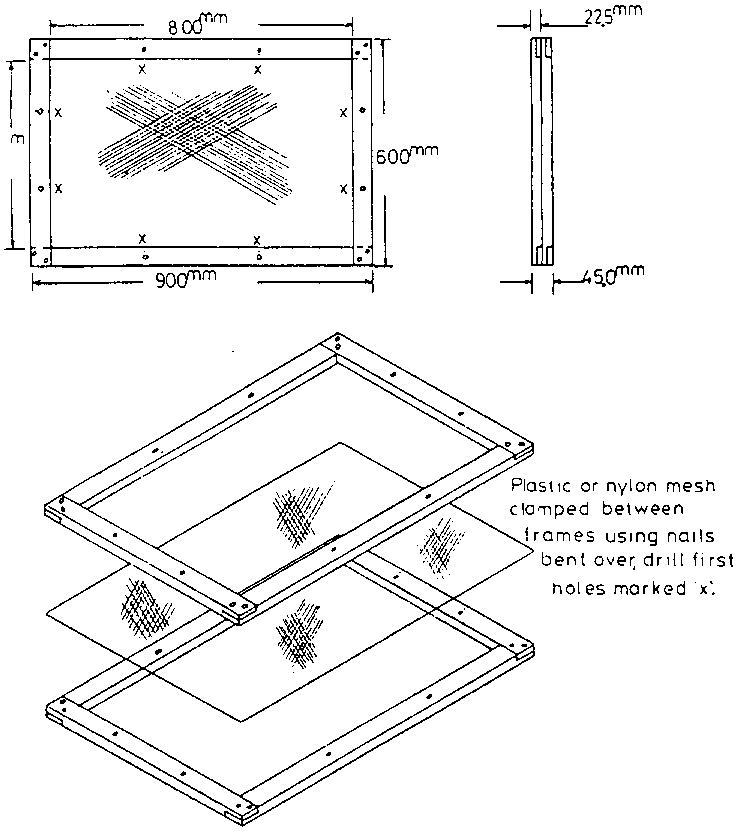 The nylon mosquito netting or grass woven mesh can be fitted between the frames as shown in the bottom drawing. Cut the mesh a little larger than the size of the frame. Using drawing pins, pin the mesh to the OUTSIDE edges of one of the frames - the mesh should be pulled tight as the pins are put in around the edges.