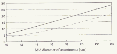 The production data for the processing operation have been obtained from other time studies of wood processor operations where the one-grip crane processor STEYR KP 40 was mounted on a skidder. All settings where time studies were carried out were on the road so that conditions for comparisons are given. According to the results of these studies, productivity depends on the diameter of the trees and the required assortments which call for different amounts of cross-cuts.