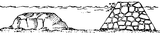 Un brise-lames en pierre doit être construit en arrière du récif (figure 3d), où il bénéficie de la protection de ce dernier. Si la zone située entre le récif et le rivage n'offre pas une marge de sécurité d'environ 30 à 50 m, il faut envisager d'ancrer un mur de béton dans le récif (figure 3c). Toutefois, s'il s'agit d'un récif constitué de corail vivant, on doit s'efforcer de le préserver dans son état naturel, ce corail étant l'une des principales sources du matériau (sable) accumulé sur le rivage; il convient alors de choisir un autre emplacement. Un récif de corail mort assure, quant à lui, une piètre protection car, sous l'effet des vagues, il finira par se désagréger et se transformer en sable, laissant ainsi le rivage entier exposé à l'action de la houle. Le corail vivant, à l'inverse, se reconstitue en permanence.