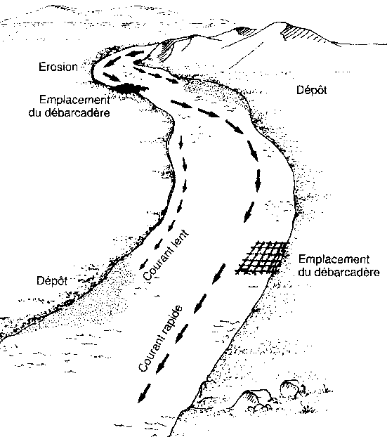 La figure 4 indique les emplacements appropriés d'un débarcadère sur un cours d'eau à méandres (sinueux). Les cours d'eau transportent en général des tonnes de limon et de sable en suspension, notamment pendant les crues. Ce limon et ce sable se déposent aux endroits où le courant ralentit. Dans un coude, l'eau coule plus lentement dans la partie intérieure de la courbe, ce qui amène le limon et le sable à s'y déposer. Au contraire, dans la partie extérieure, la grande vitesse du courant fait que la rive est en permanence soumise à l'érosion, ce qui empêche tout dépôt limoneux. Quoique ce courant rapide rende la navigation plus difficile, la modicité des coûts de dragage peut faire la différence entre un débarcadère commode, accessible toute l'année, et un débarcadère qu'il faut draguer en permanence à grands frais.
