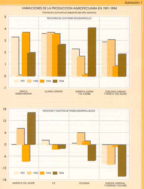 - En cuanto al Lejano Oriente, el crecimiento de la producción se redujo en 1994, si bien se mantuvo muy superior al demográfico. La República Popular de China mantuvo un intenso crecimiento en la producción agropecuaria, si bien el tiempo desfavorable hizo que fuera inferior a la media de los cinco años anteriores. En la India la campaña agrícola fue relativamente favorable y se aceleró el crecimiento de la producción tras los mediocres resultados de 1993.