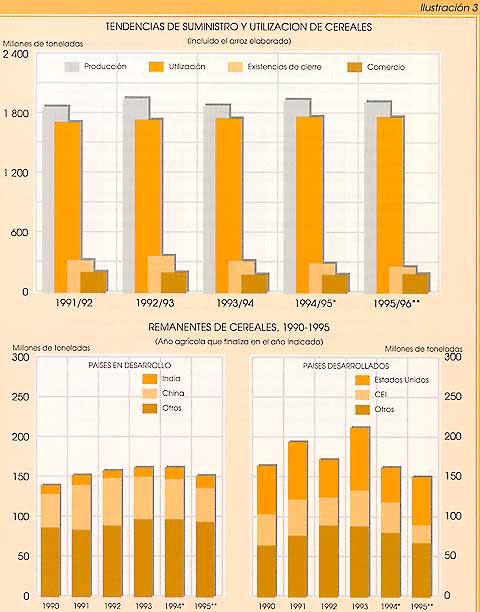 - Por lo que respecta a la situación de la oferta y la demanda en 1995/96, aunque se produjera otra buena cosecha de arroz, los suministros mundiales de cereales seguirían siendo más escasos, por lo que la relación entre las reservas y la utilización podría llegar a descender incluso por debajo del margen mínimo de seguridad. Según los pronósticos se deberá recurrir tanto a las existencias de trigo como a las de cereales secundarios, aunque se prevea que la utilización se mantendrá por debajo del nivel tendencial y no variará mucho con respecto a 1994/95. La situación podría ser incluso más delicada ya que se teme que los remanentes de trigo disminuyan a unos 106 millones de toneladas, que representarían el volumen más bajo registrado desde comienzos de los años ochenta.