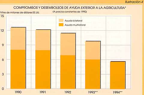 - Durante los últimos años, la asistencia exterior a la agricultura ha tendido a disminuir tanto en términos absolutos como en porcentaje del total de la asistencia oficial para el desarrollo. A los precios constantes de 1990, las asignaciones para la agricultura disminuyeron de 12 700 millones de dólares EE.UU. en 1990 a 9 882 millones de dólares en 1993 (sin contar las asignaciones de Estados Unidos en 1993; dichas asignaciones habían totalizado 506 millones de dólares en 1992). El descenso fue mucho más pronunciado en la ayuda multilateral que en la bilateral. En efecto, la primera disminuyó, a los precios constantes, de 8 071 millones de dólares en 1990 a la cifra estimada de 5 716 millones de dólares en 1993, debido principalmente a que se redujeron a la mitad las asignaciones de la Asociación Internacional de Fomento (AIF), subdirección de crédito en condiciones de favor del Banco Mundial, y a que disminuyeron en casi los dos tercios las asignaciones de los bancos regionales de desarrollo.