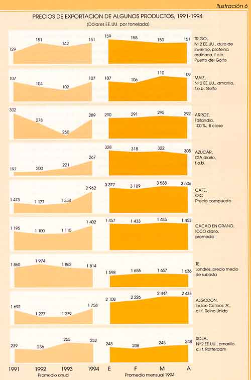 - Como confirmación de la restricción de la oferta de trigo en el mercado, los precios de exportación de dicho cereal han subido notablemente en 1994-95. También los precios de exportación del maíz se han fortalecido durante los primeros meses de 1995, debido principalmente al mal tiempo padecido en la época de la siembra en América del Norte. Los precios internacionales del arroz se mantuvieron relativamente bajos en la segunda mitad de 1994, pero se recuperaron a comienzos de 1995 debido al fuerte incremento de la demanda de importación de Bangladesh, China e Indonesia. Entre los distintos tipos de arroz, los precios de las calidades inferiores subieron más, impulsados en parte por la ausencia de China, que suele ser un abastecedor ordinario de este producto en el mercado internacional, y debido a la reducción de los suministros de Pakistán y Viet Nam.