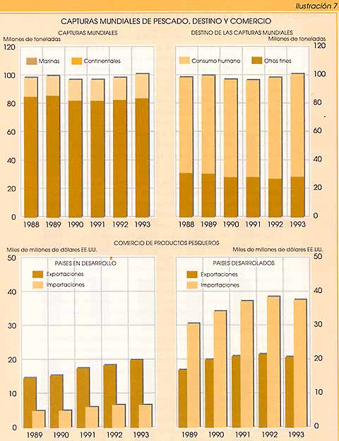 - En 1993 el total de la producción de pescado y mariscos procedentes de las capturas mundiales y del cultivo fue de unos 101,4 millones de toneladas, frente a 98,8 millones en 1992. Entre los principales productores, China y Perú incrementaron notablemente su producción en 1993, mientras que disminuyó la de Chile y la Federación de Rusia.