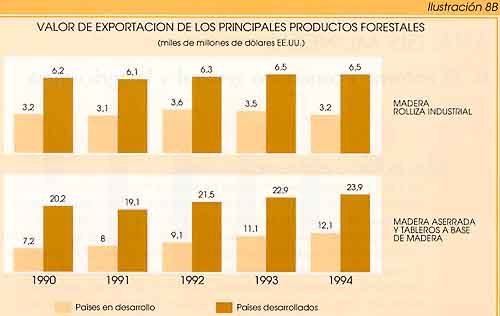 - El valor del comercio mundial de productos forestales, tras el descenso de 1993, volvió a crecer en 1994 en la cifra estimada del 5 por ciento, debido a la notable recuperación de los precios de exportación de la pasta y el papel y al incremento generalizado de los volúmenes de exportación. Además, los precios internacionales de la madera en rollo, la madera aserrada y los paneles a base de madera se mantuvieron altos. Creció el volumen del comercio mundial de todos los productos forestales, con la excepción de la madera en rollo y la madera aserrada tropical.