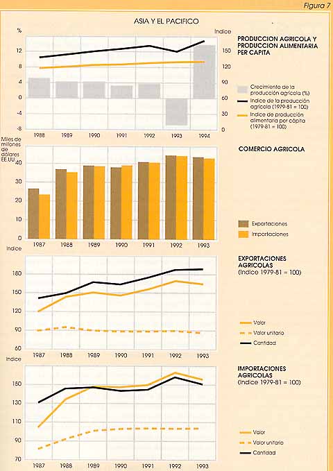 Aunque la parte de la agricultura en el PIB ha descendido de forma constante desde el 30 por ciento alcanzado a mitad de los años ochenta hasta aproximadamente el 20 por ciento de los últimos años, la agricultura continúa siendo la fuerza económica motriz y la principal fuente de empleo en muchos países de Asia. Más del 65 por ciento de los habitantes de la región viven todavía en zonas rurales y la agricultura da empleo a más de la mitad de la población económicamente activa. En general, los países de Asia y el Pacífico han conseguido considerables progresos en su intento de ampliar la producción nacional de alimentos y mejorar los suministros alimentarios agregados. El suministro de energía alimentaria diario en el conjunto de la región pasó de 2 314 kilocalorías en 1980-82 a 2 542 kilocalorías en 1990-92.