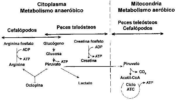 Los microorganismos obtienen mucha más energía de la oxidación aeróbica que de la fermentación anaeróbica; así, la completa oxidación de 1 mol de glucosa (u otra hexosa) vía ciclo de Krebs rinde 6 moles de CO2 y 36 moles de ATP. Por el contrario, la fermentación de 1 mol de glucosa rinde sólo 2 moles de ATP y dos moles de ácido láctico. El crecimiento aeróbico inicial en pescado es dominado por bacterias que utilizan carbohidratos como sustrato y oxígeno como aceptor terminal de electrones, con la concomitante producción de CO2 y H2O.