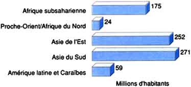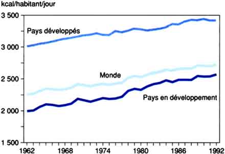 Cinquante ans après la fondation de l'Organisation des Nations Unies pour l'alimentation et l'agriculture, on constate que la production alimentaire a augmenté régulièrement et que la sous-alimentation a connu un recul sensible (figure 1). Malgré ces progrès indéniables, la FAO estime que plus de 800 millions de personnes n'ont pas les moyens de se procurer chaque jour la ration alimentaire correspondant au minimum vital (figure 2). En outre, plus de 40 pour cent de la population mondiale, soit 2 milliards d'individus, manquent d'un ou plusieurs micronutriments.