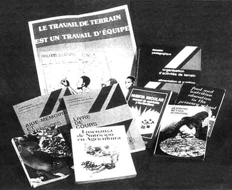 Uno de los primeros materiales utilizados para capacitar agentes de campo fue Field programme management: food and nutrition, a training pack (FAO, 1982), para capacitar agentes de campo. Este documento - posteriormente traducido al árabe y al francés - estaba principalmente dirigido a países de Africa, y varios de estos países, como Etiopía, Lesoto, Somalia y Tanzania, realizaron versiones en lenguas locales. Se desarrollaron posteriormente versiones adaptadas a las condiciones de países de Asia como China (donde más de 10 000 personas fueron capacitadas, requiriendo 2 reimpresiones del material). Filipinas, Sri Lanka y Tailandia, Posteriormente se preparó un suplemento a este material resaltando los aspectos de nutrición y población.