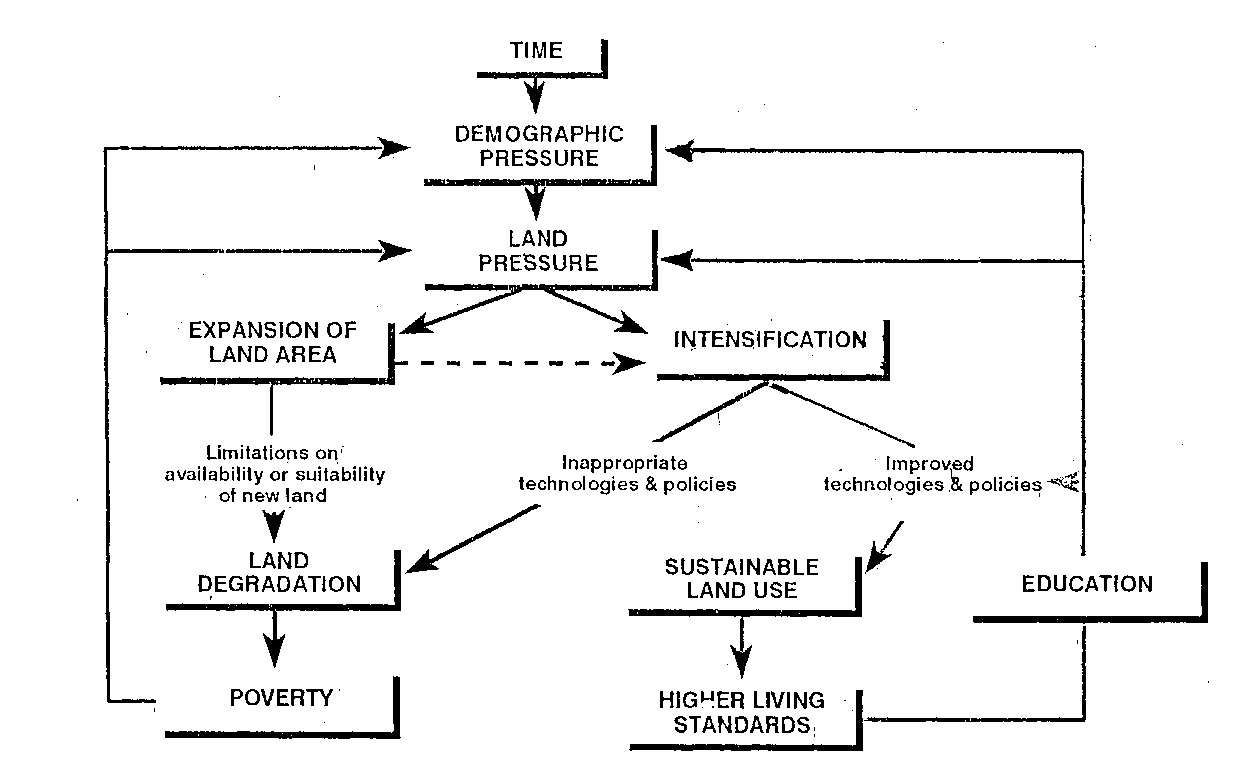 It should be mentioned that increased rural population in marginal areas does not necessarily lead to land degradation so long as improved technologies and policies are introduced (see Box 7). If basic production facilities and primary education, availability of rural credit for integrated soil-water-nutrient conservation, plus access to a nearby market for agricultural produce are improved, then higher population densities may naturally lead to intensified land use in a sustainable form (Tiffin et al., 1994).