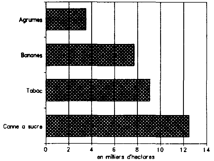 En ce qui concerne les cultures irriguées, les statistiques agricoles de 1971-72 mentionnaient la canne à sucre, le tabac, les bananes et les agrumes (pour un total de 33 000 ha) ainsi qu'une partie des cultures de coton, de blé, de riz, de palmiers à huile, d'arbres fruitiers, d'oliviers, de vignes et de cultures maraîchères (en contre-saison) (figure 4). Il faut noter que, dans le nord du pays, on pratiquait plutôt la riziculture pluviale que la riziculture irriguée.