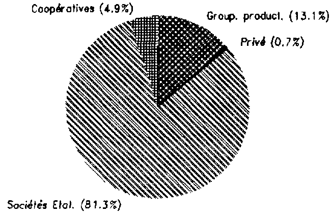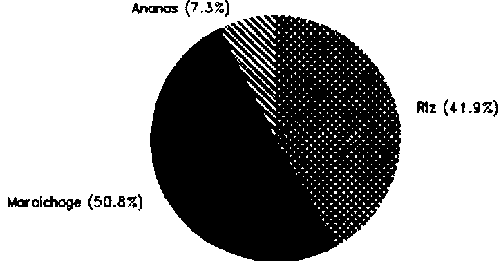 Les principales cultures irriguées sur les périmètres en maîtrise totale/partielle sont le riz le maraîchage et l'ananas (figure 8). Les différentes structures de gestion des périmètres irrigués sont les groupements de producteurs, les sociétés d'Etat, les coopératives et les sociétés privées: seuls les périmètres gérés par les groupements de producteurs restent irrigués (figures 9 et 10). Le coût moyen de réhabilitation des grands périmètres était évalué avant la dévaluation du FCFA à 9 000 $EU/ha, et le coût moyen de création d'un petit périmètre était évalué à 3 000 $EU/ha à la même époque.