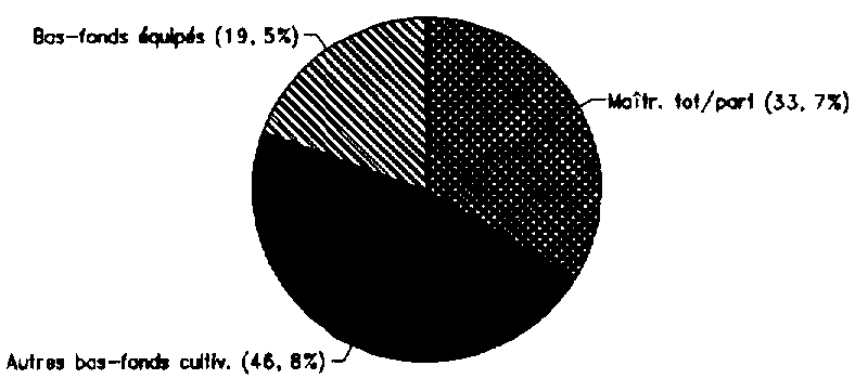 Les bas-fonds améliorés regroupent sous cette dénomination une grande variété de modes d'aménagement. Sur les 8 900 ha de bas-fonds équipés, 1 640 ha bénéficient d'un équipement important, tandis que 7 260 ha ont un équipement plus sommaire. Les bas-fonds simples représentent une superficie de 21 400 ha et sont souvent mentionnés sous la dénomination "riziculture traditionnelle".