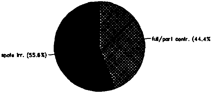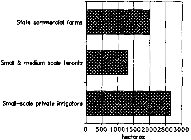 Of a Total water managed area of 28 124 ha in 1993, 12 494 ha were equipped for irrigation with full or partial control and 15 630 ha were under spate irrigation (Figure 1). The area under spate irrigation seems to be an overestimate, since much of the spate irrigation area in the eastern lowlands, an area severely affected by the war, is out of production at present. Of the area equipped for irrigation with full or partial control, only 5 969 ha, or 48%, were actually irrigated with different types of management (Figure 2).