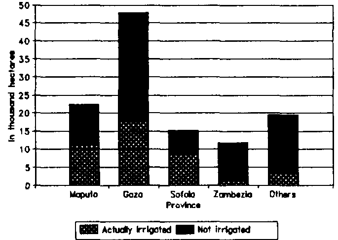There is no long tradition of farmer irrigation management in Mozambique. Thirty years ago, the Total water managed area was about 8 000 ha. After independence, irrigation was developed in State farms for the cultivation of sugar cane and rice. Family sector irrigation is mainly focused on food crops, such as rice.