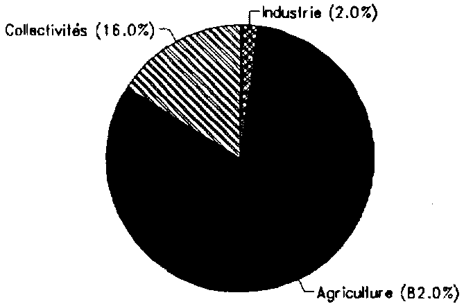 Les prélèvements en eau pour l'agriculture, les collectivités et l'industrie étaient estimés à0,5 km³ en 1988 (figure 1), dont 0,4 km³ pour l'agriculture, qui semble sous-estimé.